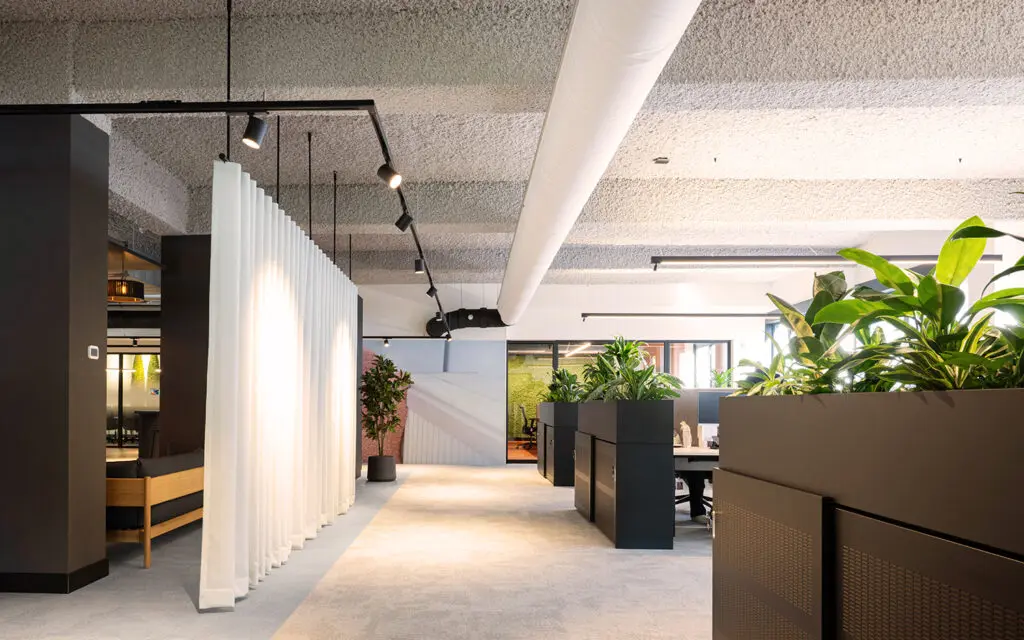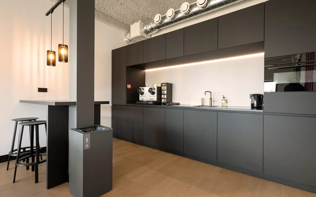 Het concept omvat kleurgebruik, materialen, meubels, verlichting en afwerkingsniveau, allemaal afgestemd op de merkidentiteit. Het ‘sociaal hart’ vormt het centrale punt van het kantoor, rondom werkplekken, overlegruimtes en afgesloten kantoren. In de pantries en open ruimtes is extra aandacht besteed aan akoestiek, groen en detailoplossingen, zodat elke functie – van concentratiewerk tot ontmoeting – optimaal wordt ondersteund.