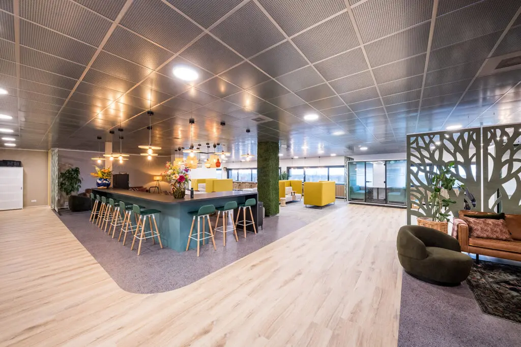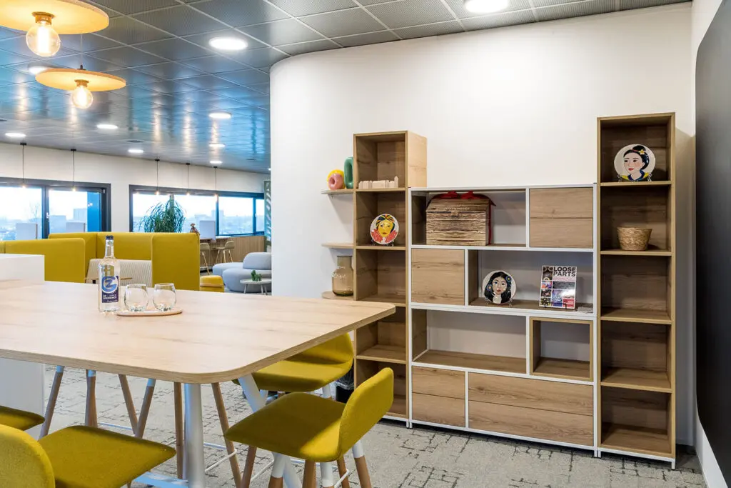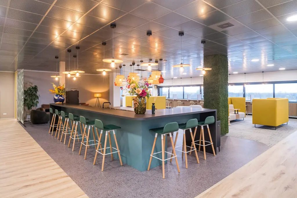 De open pantry is het kloppend hart van het kantoor. Hier komen medewerkers samen om te lunchen, te ontspannen of informeel te overleggen. Dankzij de flexibele inrichting kan de ruimte zich aanpassen aan het moment en de behoefte.