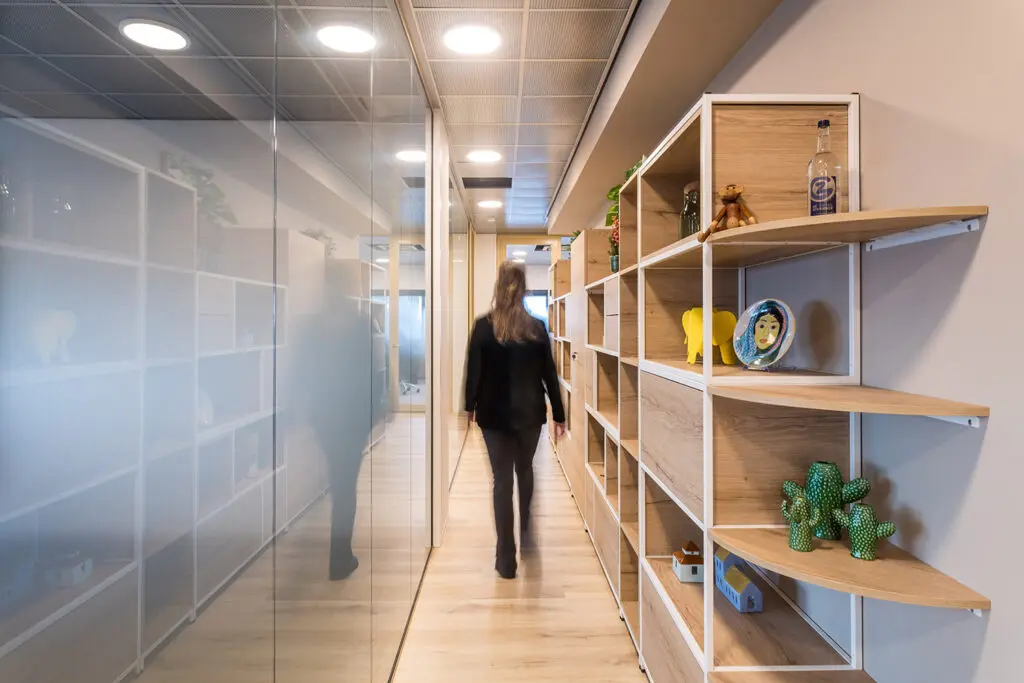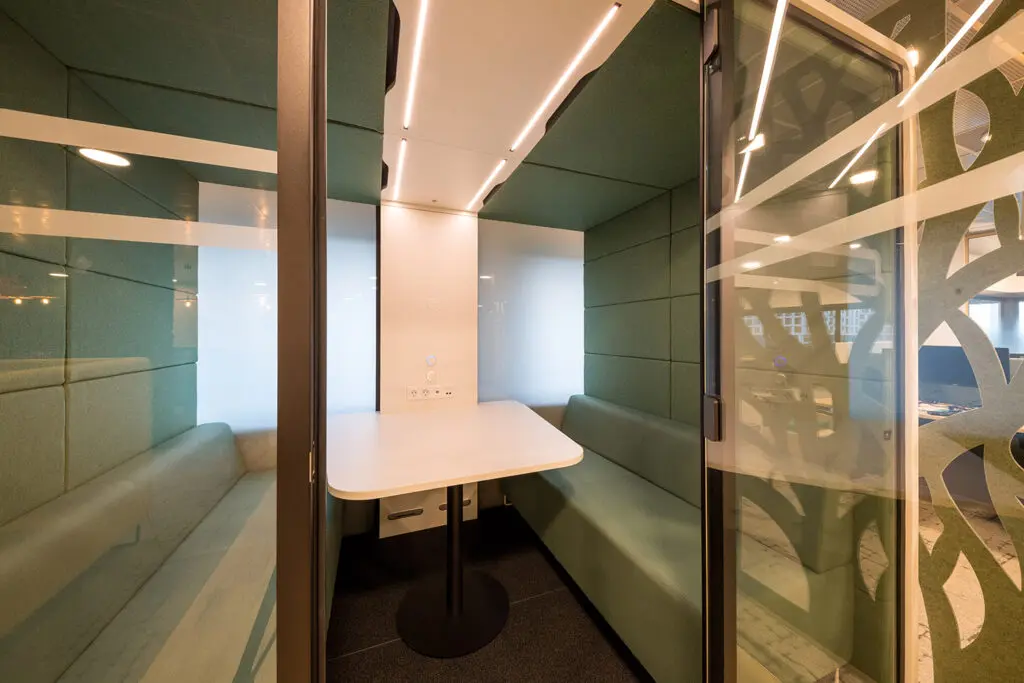 Ook de werkplekken zijn bewust multifunctioneel ingericht. Medewerkers kiezen per activiteit de plek die het beste past: aan een bureau voor geconcentreerd werk, in een akoestische belunit voor privacy of in een vergaderruimte om samen te werken. Zo ondersteunt het interieur de dynamiek van de werkdag en de diversiteit aan werkzaamheden.