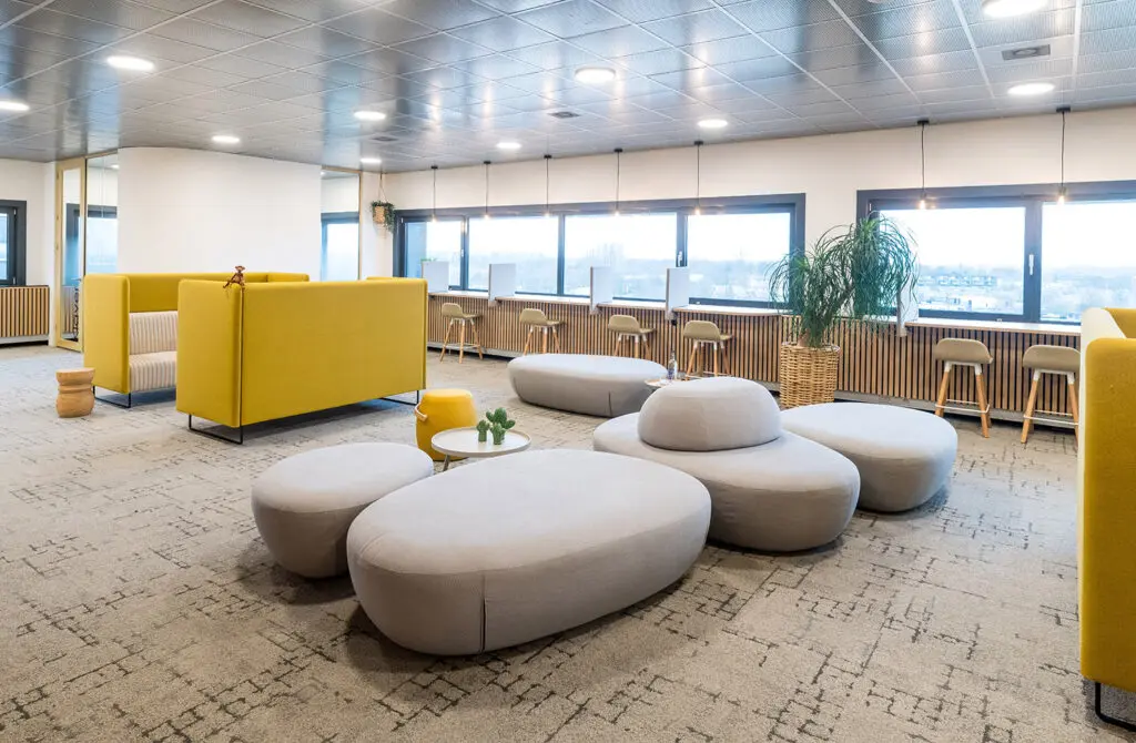 Informele zitelementen zijn vormgegeven als zwerfkeien en creëren laagdrempelige plekken voor overleg en ontmoeting. Deze speelse elementen maken samenwerken vanzelfsprekend en stimuleren creativiteit.