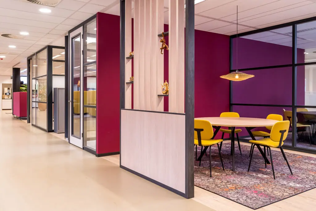 De kracht zit in het combineren van kleuren op een manier die aansluit bij de functie van de ruimte. Werkplekken waar geconcentreerd gewerkt wordt, vragen om rust en overzicht. Ruimtes waar overleg en samenwerking centraal staan, mogen juist iets meer energie en dynamiek uitstralen.